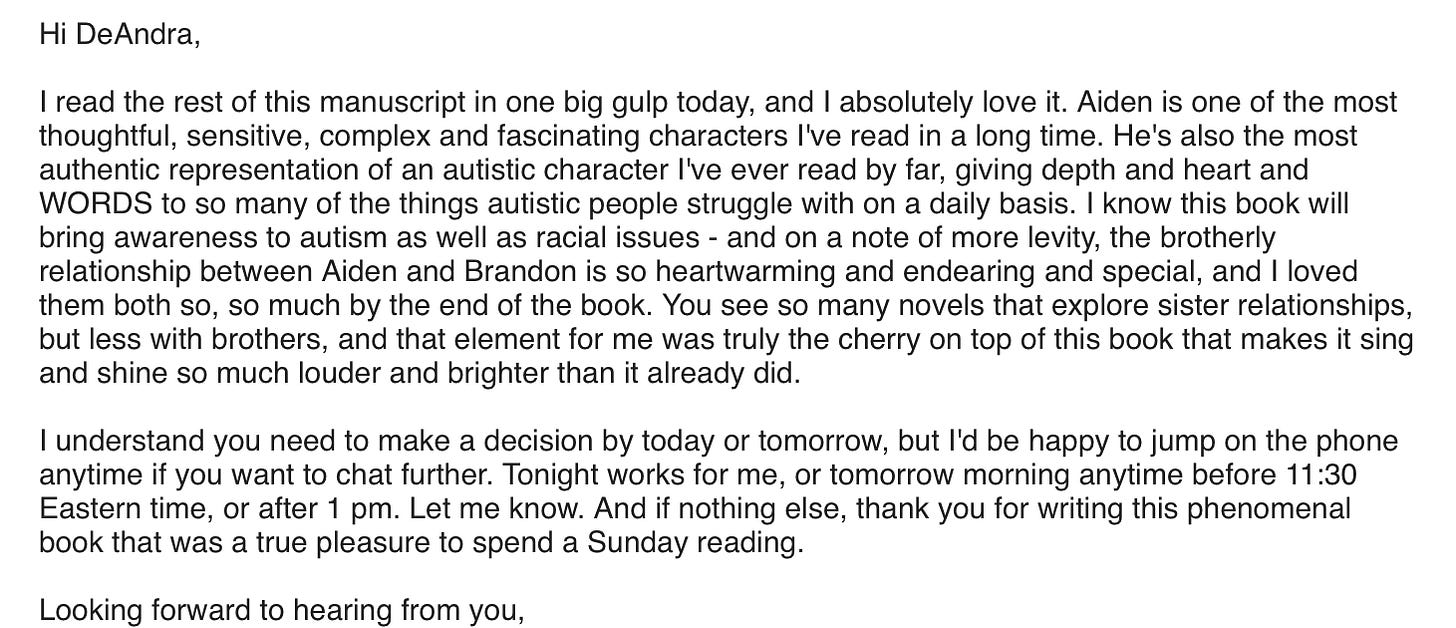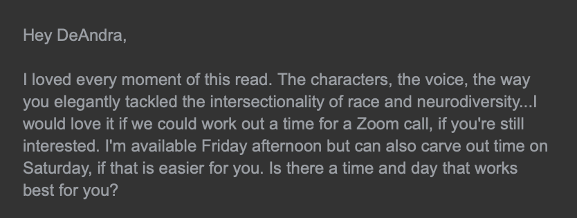 And there it is, an agent gushing about my work. An agent saying super nice things about my book. Saying they love it, they want to see more work from me, and they want to schedule a call.